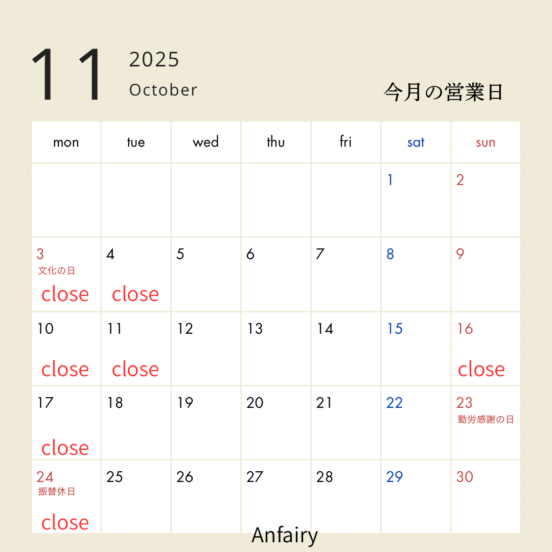 11月の定休日は、毎週月曜日と、第一第二火曜日、第三日曜となっております😄